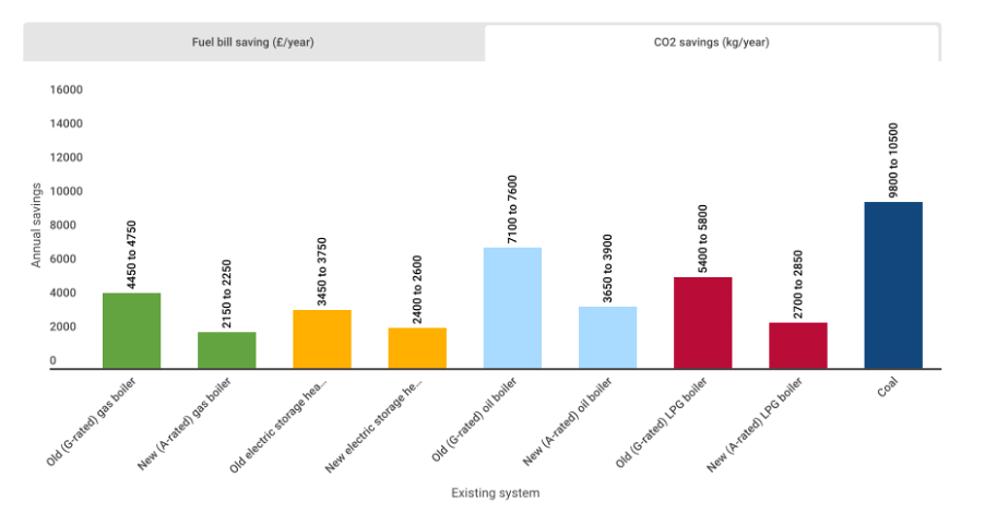 Below - potential annual CO2/cost savings of installing a standard air source heat pump in an average sized, four-bedroom detached home – courtesy of the Energy Saving Trust